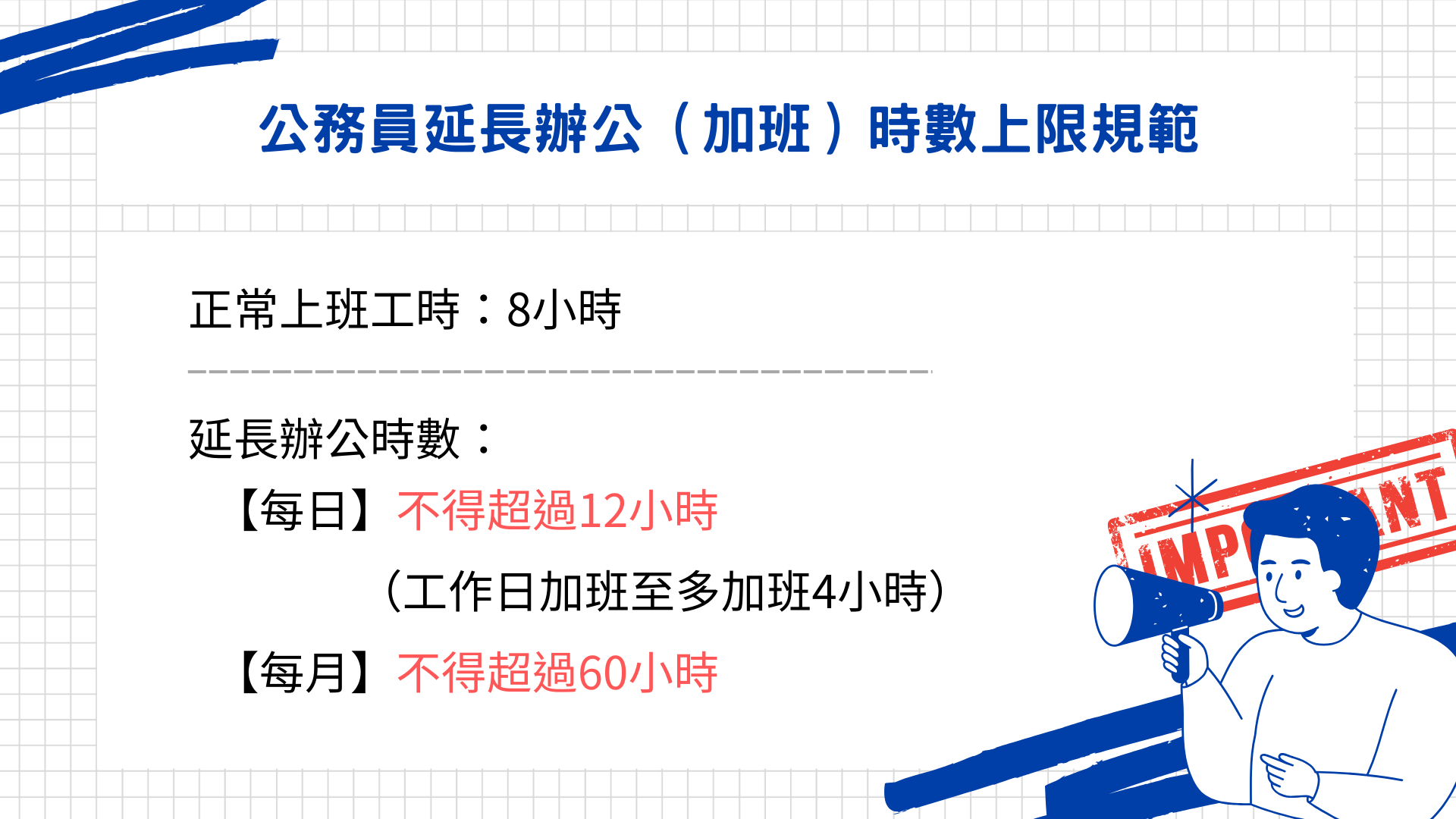 (一)各機關(構)為推動業務需要,得指派公務員延長辦公時數加班。延長辦公時數,連同第一項辦公時數,每日不得超過 12 小時;延長辦公時數,每月不得超過 60 小時。但為搶救重大災害、處理緊急或重大突發事件、辦理重大專案業務或辦理季節性、週期性工作等例外情形,延長辦公時數上限,由總統府、國家安全會議及五院分別定之。(參照公務員服務法第 12 條)